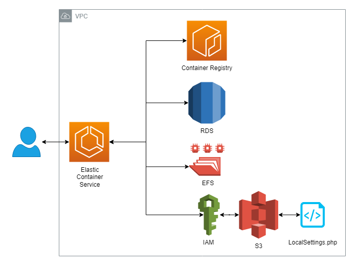 System (EFS) was attached as a volume. Secrets are added in as environmental variables to