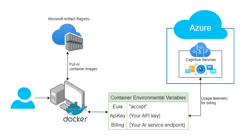In order to use the containers, you need to accept the end use license and point the container to an endpoint in your azure cloud with an API key that you get from creating the service in the cloud. The API endpoint and key are used to send usage statistics back to your Azure account so that you can be billed for consumption.