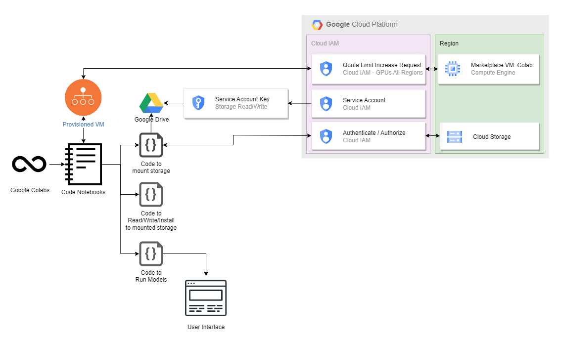 This was fairly straight forward to build up. There are however some considerations for security purposes. If you look at the diagram you see that the code to mount the storage uses google drive and a service account key. As well as a reaching out to GCP Cloud IAM and the storage buckets. This is because we are FUSE mounting the storage bucket to our provided or provisioned VM that Colab is running on. But to do that we either needed to have an entirely public bucket with read and write access (not recommended) or we needed to store our access credentials in our code (Also not recommended). So we created a service account which is Googles name for an account that is authorized to access some part of your cloud that will be built into code and not a human performing the access. You can then export a JSON file with access credentials. Here we store that in our google drive so it is not public but can be accessed by our Colab instance that can then use that credential file to authenticate to our cloud storage and read/write files.